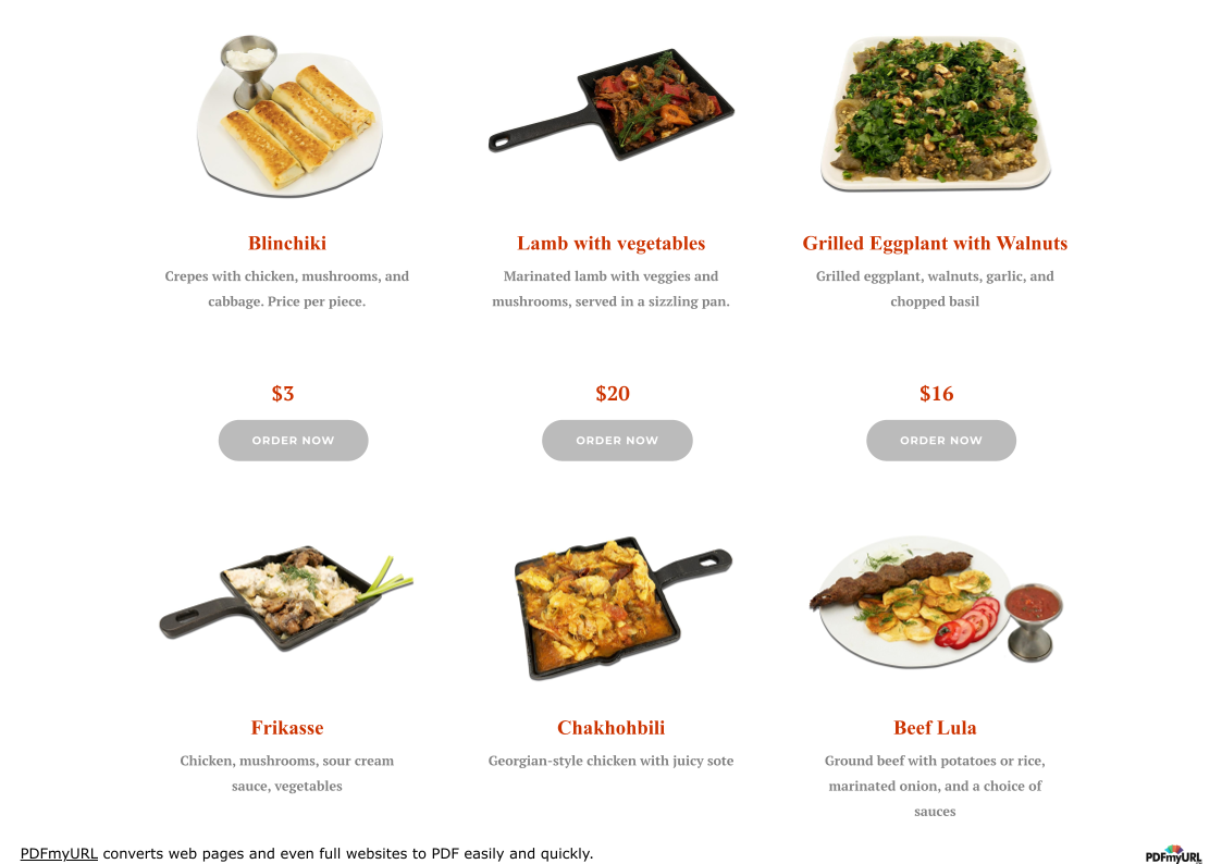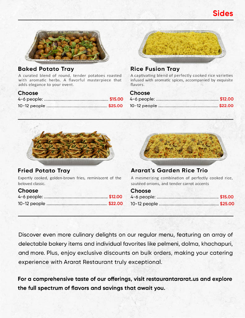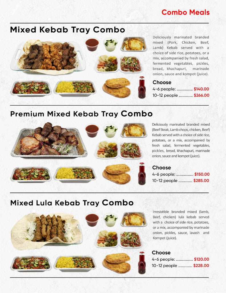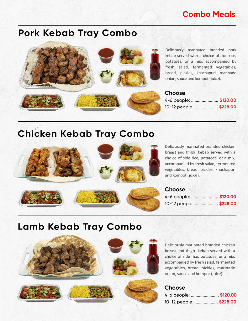 Pork, Chicken Breast & Thigh, Beef, Lamb with side rice, potatoes, or a mix, fresh salad, pickles, bread, khachapuri, and sauce.