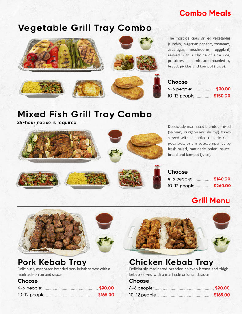 Beef Steak, lamb chops, chicken, lamb, beef Kebab with side rice, potatoes, or a mix, fresh salad, pickles, bread, khachapuri, and sauce.